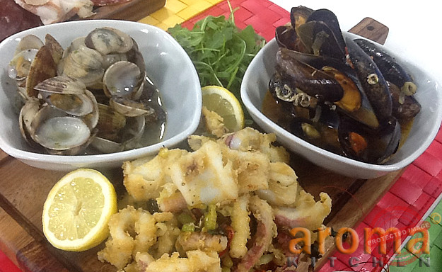 King prawns cook with some garlic, basil and olive oil in a pan. Vongole cook in a pot with some garlic, basil and white wine. Mussels same like vongole and add some tomato sauce. For the calamari first cut in small pieces and marinate with some sesame oil, fish sauce, 5 spice and egg. Then pass through flour and deep fry for few seconds. Toss in a pan with some spring onions, garlic, basil, chili and sugar. Serve all items on a board with some lettuce and lemon as a garnish.