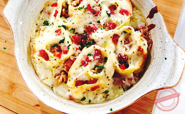 Start this recipe by preparing the béchamel sauce. Gently bring the milk to the boil in a small saucepan with the onion, studded with the bay and cloves. Turn off the heat and leave to infuse for 20 minutes. Melt the butter in another saucepan, then add the flour. Stir continuously until a paste forms a roux and continue cooking for 2 minutes. Remove the onion, bay and cloves from the milk and discard. Add the infused milk to the roux gradually, stirring as you go, until you get a smooth sauce. Cook for 5 minutes, stirring continuously until the sauce has thickened. Season to taste and put aside. Next, mix together the ricotta, egg, chopped walnuts, 2 tbsp Parmesan cheese and chopped herbs and season well with pepper and salt. Lay out the fresh pasta sheets on to your work top and spread over the ricotta filling. Cover each with a slice of smoked ham and roll up. Cut the roll into 1 inch thick slices. Cover the base of 4 individual oven dishes with a little of the béchamel sauce and lay the pasta rotelle on top. Pour over the remaining sauce to cover and toss over the diced pancetta. Bake in the oven at 200`c for 15-20 minutes or until the rotelle begin to take on a golden colour around the edges. Remove from the oven, decorate with a few salad leaves and serve immediately.