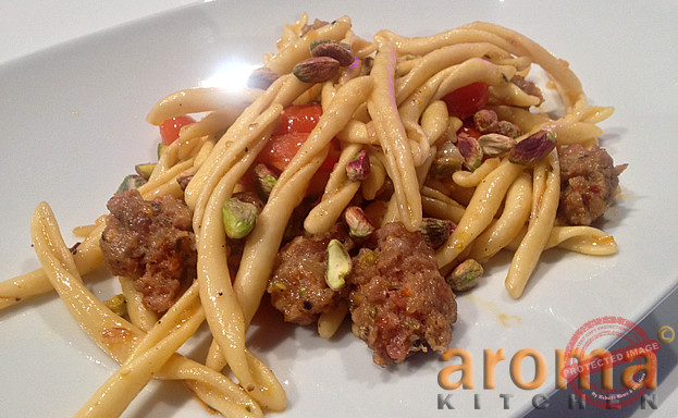 Fresh pasta with spiced sausage, fennel, orange, cherry tomatoes and pistachios