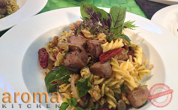 Fresh seared tuna pasta salad with pesto, sun-dried tomatoes and walnuts