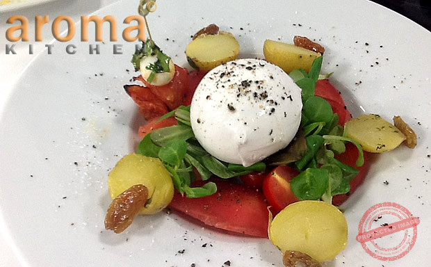 Cut the cherry tomatoes in half and bake in oven with a dash of olive oil and freshly crushed peppercorns cook for 3 minutes .Meanwhile, peel and deseed the flat tomatoes and dice pieces to use for the dressing. Add the olive oil salt, pepper and a little vinegar and mix together well. In a separate bowl, mix together the lettuce and the baked cherry tomatoes. Add some dressing and place in serving dish. Arrange the mozzarella and serve.
