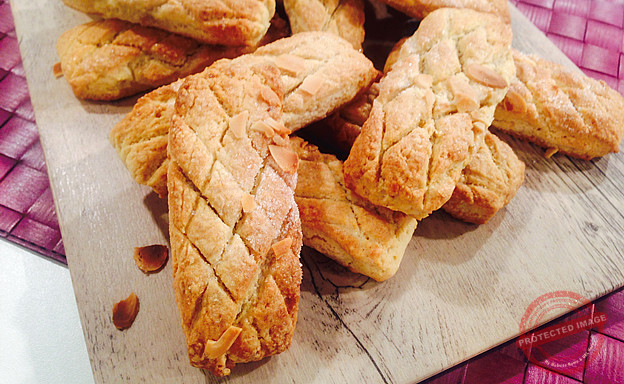 Start this recipe by preparing the pastry. Sift together the flour, baking and icing sugar in a large bowl. Add in the butter and rub together with your fingers till the mixture resembles breadcrumbs. Add the orange zest, fresh orange juice and egg yolks and mix together till you have a smooth soft pastry. Wrap up the pastry in cling film and chill in the fridge for 30 minutes. Meanwhile, you can also prepare the almond filling. Place all the ingredients together in a large bowl and bind together with your hands to form a soft marzipan. Make sure the mixture is not sticky. Once the pastry has chilled and you have prepared the almond filling, you can start preparing the almond fingers. Roll out the pastry on a floured work surface to a large rectangle 6mm in thickness. Roll out the almond filling on a work surface dusted with icing sugar to the same thickness, the same length as the pastry but half the width. Brush the pastry with a little water using a pastry brush and place the almond filling on top in the middle. Brush the almond filling with a little water and wrap over the excess pastry on both sides. Press the seams together well and turn the whole thing upside down so that the seam is at the bottom. Cut the filled pastry into small fingers 3cm in width and brush the top with a little water. Sprinkle over the chopped almonds and sugar and carefully place the almond fingers on baking sheets lined with non-stick paper. Bake in the oven at 200`c for 25-30 minutes, or until the almond fingers are a light golden colour. Remove them from the oven and place on a wire rack to cool down completely before serving.