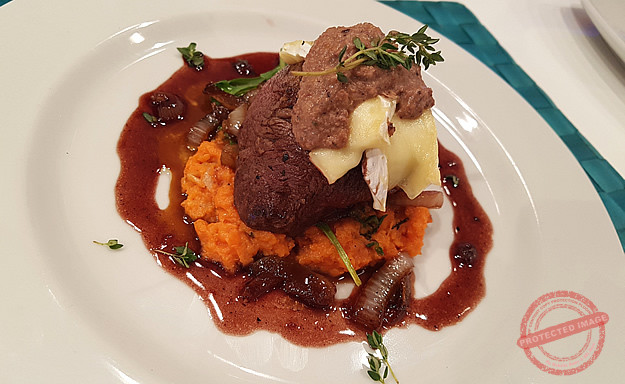 Fruity rabbit liver and beef fillet on a sweet potato thyme mash with red balsamic caramelized onions