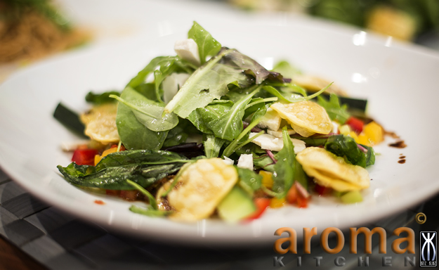 Gazpacho, fried ravioli, rucola and ricotta salata salad