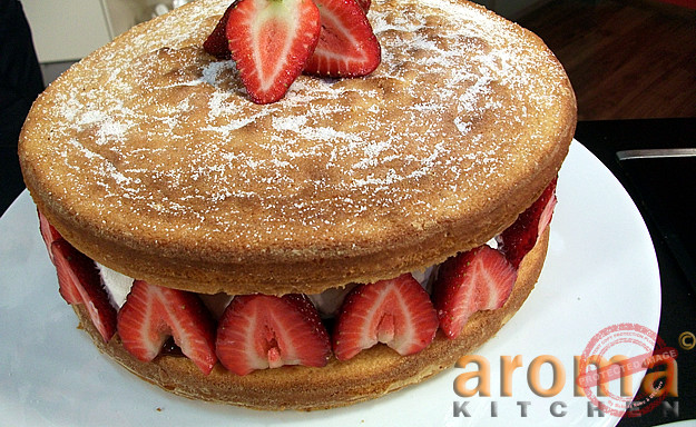 Start this recipe by greasing and flouring to 20cm round cake tins. In a medium sized bowl, beat together the eggs and the caster sugar using an electric whisk till the mixture becomes light, pale and fluffy(this should take 4-5 minutes) Fold in the melted butter, and sift in the flour. Continue folding till the flour is well incorporated. Carefully spread the mixture into the prepared cake tins and bake in the oven at 180`c for about 15 minutes. Remove the sponges from the oven, and allow to cool completely before removing from the tins. Meanwhile, whip the cream to stiff peaks with a tablespoon of the icing sugar. When you are ready to put the cake together, take one of the round sponges and place it onto a serving plate. Spread half of the whipped cream over the top, and carefully arrange over the hulled strawberries, reserving 3 to decorate. Fill in the gaps between the strawberries with the remaining cream place the second sponge on top, gently pressing down. Dust the remaining icing sugar over the top and arrange the reserved strawberries in the centre. Chill well before serving.