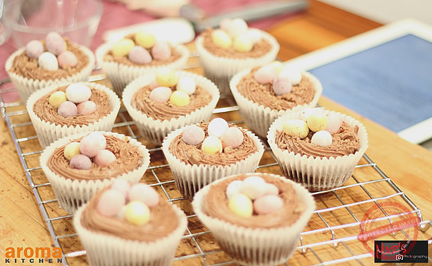 Beat together the cream cheese, sugar, vanilla and lemon juice together for 1 minute till soft. Beat in the eggs, one at a time followed by the lemon zest and cocoa powder. Line a 12 hole muffin tin with double paper cups. Place a gluten-free biscuit in the base of each paper cup and fill with the cheesecake filling. Bake in the oven at 180`c for 20 minutes, or until the cheesecakes have risen and just beginning to crack. Allow to cool before decorating with piped chocolate butter cream nests and chocolate coloured eggs.