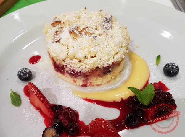 Place the berries and 2 tbsp sugar in a saucepan and cook down for 5 minutes. Cut the muffins into 1cm slices. Make a crumble by rubbing together the flour, sugar, butter and lemon zest. To put this dish together, grease 2 small individual metal rings. Place on a baking tray and add in layers of sponge and cooked berries twice. Finish off with the crumble mixture. Bake in the oven at 200°c for 15-20 minutes and serve with any leftover cooked berries and the warm custard.