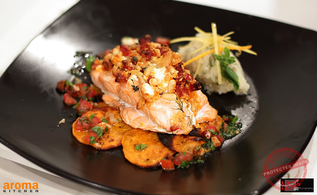 Cut a slit, length wise through the salmon until close to the skin. In a separate recipient, crush the biscuits and mix together with the chorizo, orange zest, thyme, pine nuts, olive oil and crumbled feta cheese. Place the fish fillets onto a baking tray and press the biscuit stuffing into it. Bake in a luke warm oven for approximately 10 minutes. For the braised fennel; mix the fennel, onion, bay leaf, garlic, white wine and butter and put into a baking dish. Cover with aluminium foil and braise for 20 minutes in a hot oven until soft. Sweet potato gallette, start placing the potato slices overlapping into a circle. Brush with melted, season with salt and pepper, bake in a moderately hot oven until potatoes are cooked and golden.