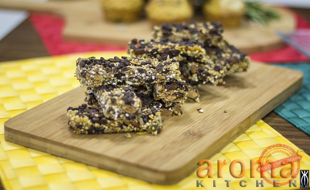 Start this recipe by toasting the muesli in the oven on a baking tray for just 3-4 minutes. This will improve the flavour of the cereal bars. Allow to cool. Place the honey, butter , brown sugar, vanilla and salt in a saucepan and melt down together to dissolve the sugar. Take off the heat and add in the toasted muesli and cranberries. Mix together well, then add in ½ of the chocolate chips. Line a 20cm square cake tin with non-stick paper and press in the cereal bar mixture, evening out well. Finally, sprinkle over the remaining chocolate chips and press in again. Place in the fridge for at least 2 hours to set before cutting into bars.