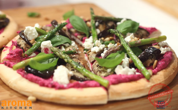 To make the hummus, place all the ingredients in a food processor and blitz for 30 seconds till you have a nice smooth dip. You made need to stop half way and scrape down the sides during blitzing. Next, cook the pizza bases in the oven for 10 minutes. Spread over the pink hummus, grilled aubergines and finish off with the fresh mint leaves and the toasted pine nuts.