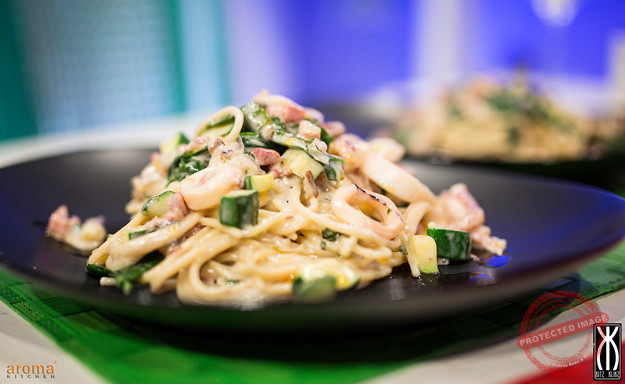 Gluten free pasta with anchovies, pancetta and calamari garlic courgettes