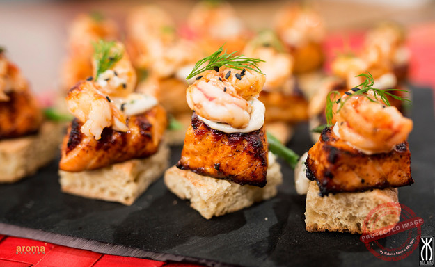 Cut the 2 foccacia in 12 foccacia canapé base, trim the height and toast from both sides. Peel and cut the prawns lengthwise than sauté in olive oil with chopped garlic and parsley, remove from heat and trim the. Blend the prawn trimmings with the dill and cheese and using a piping bag pipe on each foccacia. Cut the Salmon fillet in 30g cubes, place on an oven tray drizzle with honey, season and grill until browned. Place the salmon beside the cream cheese on the canape with the prawn on top and sprinkled with seeds.