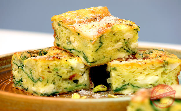 Heat the oil in a pan and saute together the spring onions and garlic for 4 minutes. Add in the spinach to wilt. If any water is released, remove it from the pan. In a large bowl mix together the flour and baking powder. Add in the eggs, milk and melted butter and whisk together. Add in the cooked spinach mixture, chopped basil, crumbled Greek cheese and mozzarella (DO NOT OVER MIX) Transfer to a buttered rectangular oven dish, sprinkle over the Parmesan cheese and bake at 180`c for 40-45 minutes. Allow to cool down for 10 minutes before serving cut into squares.