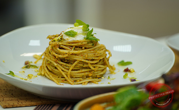 Gluten-free spaghetti with sun-dried tomato and walnut pesto and creamy mozzarella