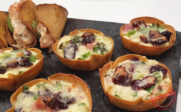 Cut the tortilla into discs that fit mini muffin trays, push and press into the moulds. Chop the gammon, cheese and spring onions and divide into the flans. Beat together the eggs, cream and parsley, pour into the flans and bake at 175⁰c for approximately 15 minutes until the quiche sets.