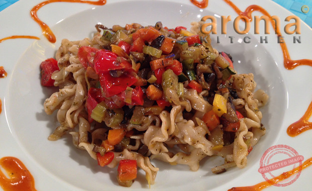 Gluten-free vegetarian mafaldine alle basilica with Mediterranean sauce