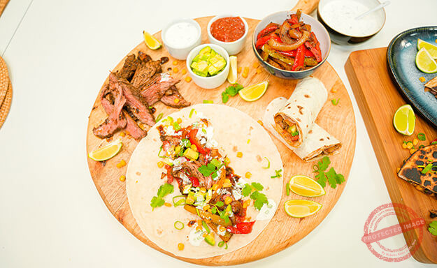 Start this recipe by marinating the beef. Rub the beef with 1 tbsp. olive oil. Place spice mix, coffee, cumin and chili into a bowl and mix together. Rub half over the meat and allow to marinate for 30 minutes. Meanwhile, make a sour cream by mixing together the cream, garlic, green chili, chopped coriander and the juice and zest of 1 lime. Season with salt and pepper and place into the fridge to chill. Heat a large pan and quickly seal the meat on both sides. Transfer to an oven dish and continue in the oven at 200°C for 5-8 minutes depending on it’s thickness. In the same frying pan, add in the remaining oil and fry together the onions and peppers along with the remaining spice mix for 5 minutes. To serve, remove the meat from the oven, allow it to rest for 3 minutes then slice it up thickly. To serve, heat the wraps and lay over the cooked beef strips, peppers and onions and serve the sour cream, salsa and avocado on the side.