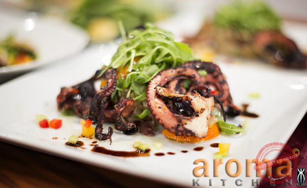 Divide the octopus into tentacles, season with salt and pepper. Marinade with garlic, rosemary, orange and lemon juice. Grill the tentacles on a griddle pan until crispy. Cut the potatoes in halve, and mix with the olives, capers and sundried tomatoes crush. Bind with enough mayo. Place the tentacles on a serving plate, drizzle with olive oil and garnish with fresh chilli. Top up with salad leaves and drizzle with lemon infused oil. Serve with the warm potato salad.