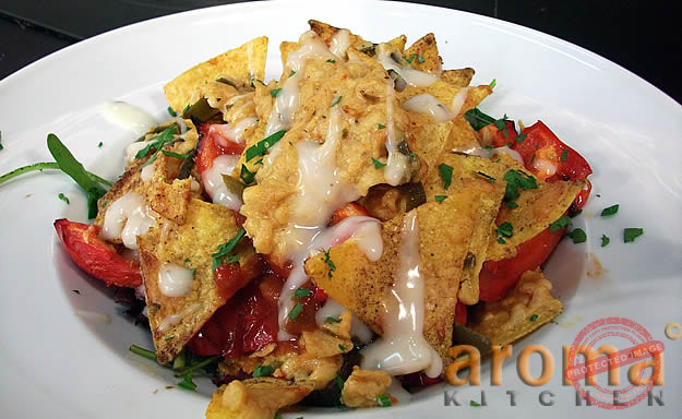 This is a very quick and easy dish to prepare. Start by placing the mixed peppers on a baking tray and drizzle over the olive oil. Season well with salt and pepper and place under a hot grill to cook the peppers. You can alternatively cook the peppers on a hot plate or griddle pan. When ready, remove the baking tray from the oven and spoon the spicy salsa over the cooked peppers. Pile the tortilla chips on top of the salsa and sprinkle over the green jalapenos. Finally, sprinkle over the grated mexicana cheese. Place the tray under a hot grill again, just for a couple of minutes to melt the cheese. Meanwhile, place the mixed salad leaves in the middle of 2 large deep serving plates. Remove the tray with the melted cheese tortillas from out of the oven and pile this mixture over the salad leaves in the 2 serving plates. Just before serving, spoon over some sour cream and sprinkle with some chopped parsley.