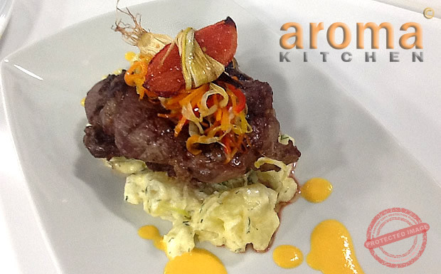 Grilled rib-eye beef with mini stir fry and marmite sauce