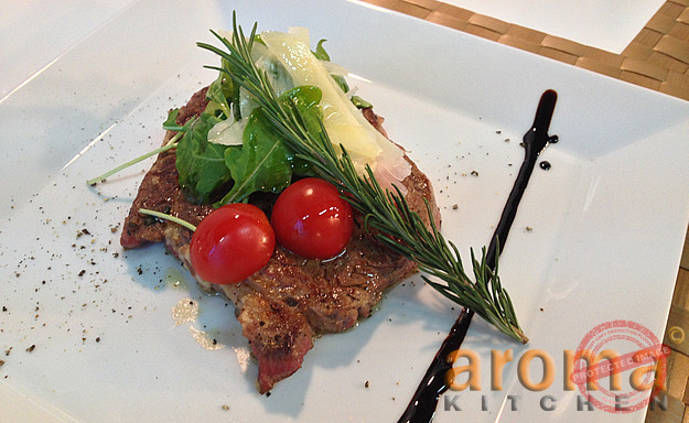 Grilled rib-eye served with rucola, Parmesan and cherry tomatoes