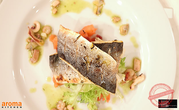 Trim the fish fillets sprinkle with lime zest and juice, drizzle with oil oil season and grill in the oven. Next, peel and dice the potatoes, boil until medium soft, drain and add the warm seafood liquid only and beetroot and continue to simmer together. keep the seafood and sauté in lightly in garlic, remove from heat and allow to cool. Blend well the parsley, basil and oil together, mix with the seafood and season. mash the potatoes roughly and serve underneath the grilled fish with the crispy salad and drizzled with the herb seafood dressing.