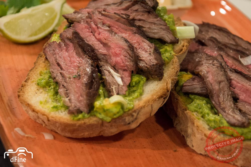 Start this recipe by rubbing the flank steak on both sides with salt, pepper and olive oil. Heat a large griddle pan and sear the steak on both sides. Continue to cook till medium or to your liking before removing from the pan and allowing to sit for a few minutes. Meanwhile, prepare the avocado by dicing the flesh of 1 avocado and mashing the other. Mix together with the lime juice, garlic, spring onion, coriander and season well with salt and pepper. Next, toast the Maltese bread and liberally spoon over the avocado mixture. Slice up the cooked and rested flank steak and lay on top of the bread. Mix together the sour cream with the tobacco sauce and serve on the side.