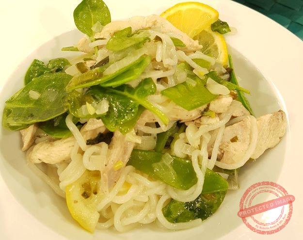 Cut the chicken into fine strips, season with salt and pepper and quick fry in olive oil with the garlic. Cut a few thin slices of lemons and add to the chicken, squeeze the rest. Splash with vegetable stock and simmer until chicken is cooked and tender. Drain the pasta and toss with the chicken, stirring in the parsley, spinach, mange tout, chili pepper and finish with a knob of butter.