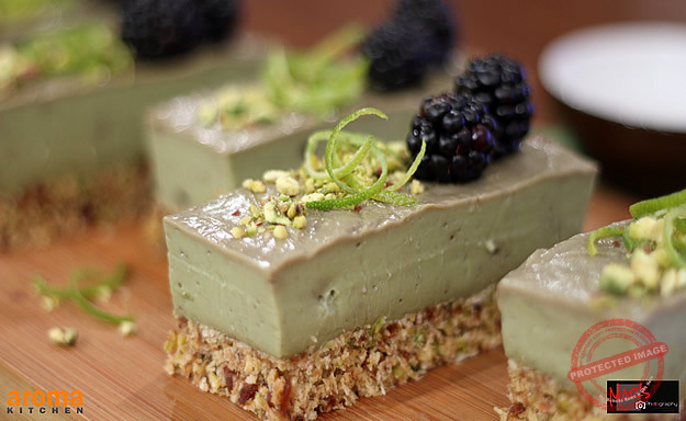 Start by lining a loaf tin with grease proof paper. Next, make the base by whizzing together the coconut, pistachios and dates. Press into the base of the tin. Next, soak the gelatine in the lime juice for 4 minutes, then heat up in the microwave to melt. Place the avocados in a processor with the lemon and lime zest and yogurt and blitz for 10 seconds. Pour in the melted gelatine and whiz together till combined. Spoon the filling over the base and even out. Cover the top with cling film and chill for 2 hours. When ready to serve, cut into thick fingers and decorate the top of each piece with blueberries and pistachios.