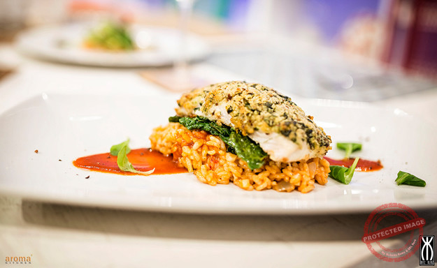 Herb crusted grouper on apple and prawn risotto, peppered tomato sauce