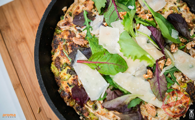 Start this recipe by heating a bsp of olive oil in a large pan and soften the garlic and onion for 2 minutes. Add in the split broad beans and peas and cook for just 2 minutes. In a large bowl, beat together the eggs. Remove the low carb spaghetti from its bag, drain away any liquids. Add the spaghetti to the eggs, season well with salt and pepper and mix. Add in the ricotta, cooked peas and beans, grated Parmesan if using and the herbs and mix together well. Heat the remaining oil in a large pan and fry the frittata for 5-7 minutes on each side or until golden. To serve, transfer onto a large wooden board, top with the rucola and walnuts and serve.