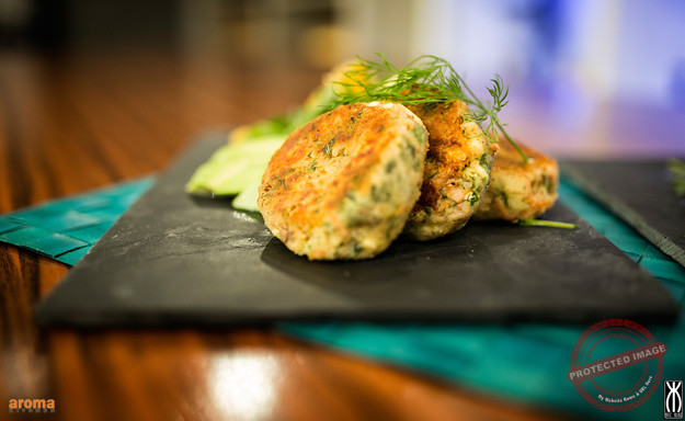 Pulpetti tat-tonn imħawra ma' insalta tal-ġobon feta, avokado u larinġ