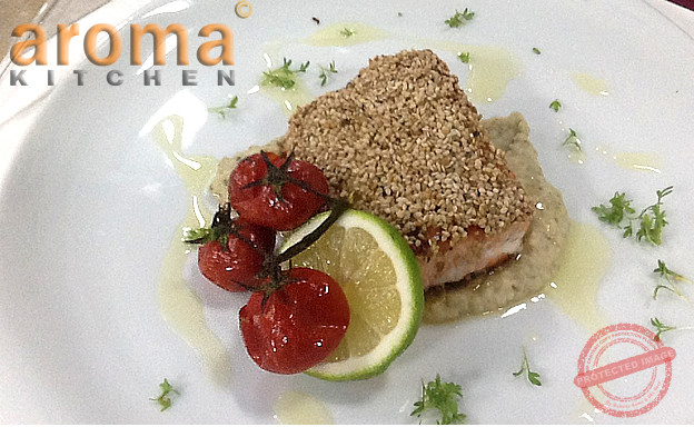 Honey and sesame seed salmon with aubergine caviar and yogurt dill sauce