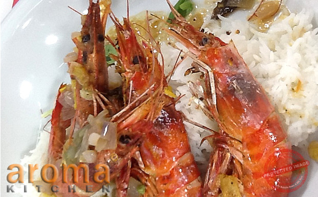 Start by cooking the rice in boiling water for 8 minutes. Meanwhile, preheat a pan and seal the prawns for 2 minutes on each side. Add in the lemon juice and white wine and reduce. Next, pour in the vegetable stock and simmer to reduce the sauce to the correct consistency. Finally, stir in the chopped basil and butter for flavour and serve with the cooked rice .