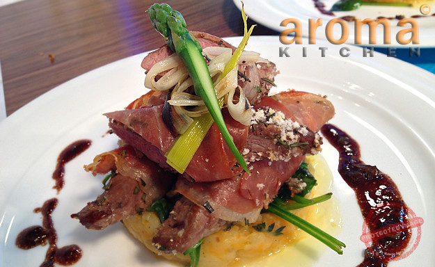 Lamb fillets wrapped in Parma ham with rosemary and garlic infusion