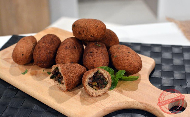 Start this recipe by preparing the filling. Heat the oil in a pan and toast the pine nuts till golden. Remove from the pan and add in the onion and garlic and sauté till soft. Add in the lamb mince, spices and season well with salt and pepper and cook for 5 minutes. When ready, stir in the pine nuts and parsley and remove off the heat. To prepare the dough, place the onion, herbs and spices, chick pea flour and lamb mince into a food processor and blitz together. Next, squeeze out all the extra water from the bulgar wheat by squezing I a clean tea towel and add to the processor. Season well with pepper and salt and blitz together. To form the Kibbeh, take a golf ball size of the dough and form into a flat circle using a little water to wet your hands. Spoon in a little of the cooked lamb filling and seal the ends together well. Form into the correct shape and repeat the process with the remaining ingredients. To cook the kibbeh, heat the oil to about 180`c and fry them in the hot oil in small batches till golden brown. Remove with a slotted spoon and drain on kitchen towel. Serve with minted cucumber yogurt salad.