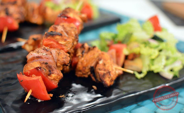 Start this recipe by mixing together in a medium bowl the yogurt, tomato puree, drizzle olive oil, chopped garlic, herbs and spices and season well with salt and pepper. Add in the chicken cubes and allow to marinate for at least 2 hours. When you are ready to cook the chicken, alternatively thread the marinated chicken pieces with peppers and onions onto skewers. Heat a griddle pan with a little oil and fry the skewers on all sides till cooked through. When ready, prepare the fattoush by mixing all the ingredients together in a bowl. Serve the fattoush on the side with the chicken shish taouk.