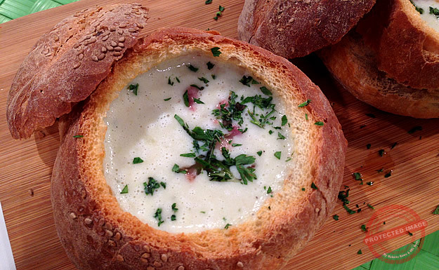 Start this recipe by cutting the tops of the bread. Remove all of the filling to just leave a crust. Place into the oven and bake for 10 minutes until the bread is hard and crispy both inside and outside. Meanwhile, heat the oil and butter in a large saucepan. Add in the red onion, garlic and sliced leeks and sauté for a few minutes. Add the chopped potatoes and continue to cook for 2 more minutes. Add in the vegetable stock, herbs and season well with salt and pepper. Lower the heat, and simmer the soup for 15-20 minutes, or until the potatoes are soft. Pour in the milk and turn off the heat. Meanwhile, put the pancetta in an oven-proof dish, and grill for a few minutes until golden and crispy. When you are ready to serve the soup, remove the thyme and bay leaf. Pulse the soup with a blender till smooth and pour into the prepared bread skins. Drizzle over the pouring cream, sprinkle over the crispy pancetta and serve immediately