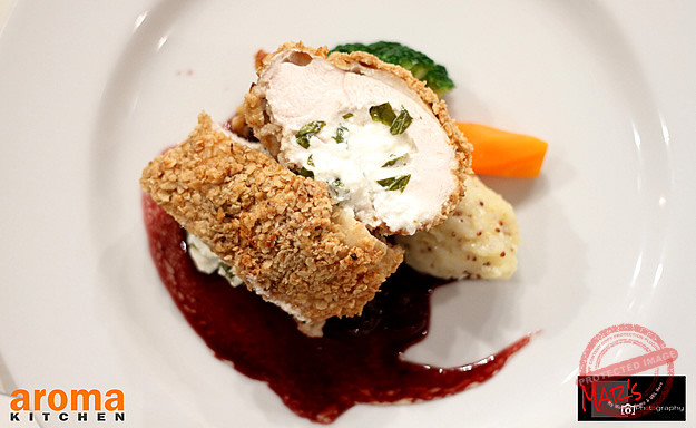 Using a sharp knife create a pocket lengthwise across the chicken supreme, meanwhile mash well the feta and basil and stuff with. Zest the lime and mix with the oaths, beat the eggs and flour into a batter. Dip the stuffed chicken into the eggs than roll on the oaths and deep fry until golden than finish in the oven until cooked through. Soak the porcini in the wine and leave for at least and hour. Peel and boil the potato until softened than mash together with the mustard seasoning, knob of butter and also some cream. Turn the carrot in barrel shape, blanch and sauté in salted butter. Blanch also broccoli and season. In butter sauté the garlic and chopped onion until softened on low heat add the sugar and caramelize on high heat. Pour in the wine and porcini and reduce by half.