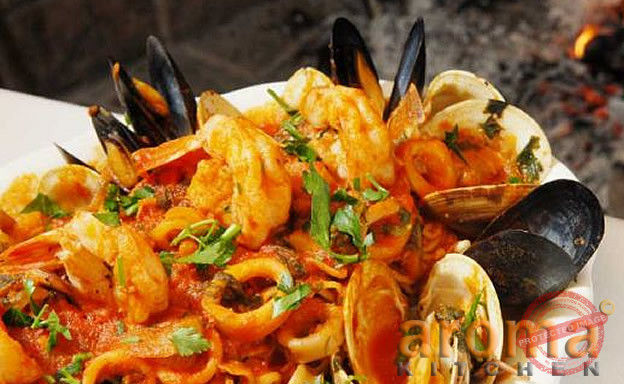 Linguine tossed with calamari, mussels, white clams and tomato sauce