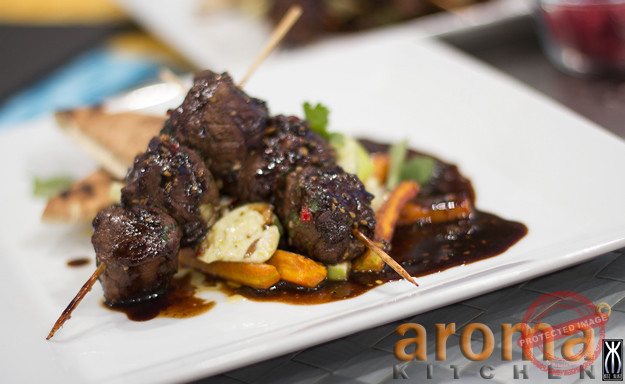 Cut the beef in cubes and mix well in a bowl with all the other ingredients, allow to rest for 2 hours and than put the beef into the skewers. Preheat well a griddle pan and grill the beef to medium, remove and simmer some of the left marinade to glaze the beef with. Grill the pitta, quarter and serve on the side. To prepare the salad, cut the carrots in fingers and place on an over tray, melt the butter and drizzle on the carrots. Sprinkle the sugar on and bake until browned.mix the pesto with the yogurt in a bowl, Slice the apple and mix with yogurt. Roast the almond crush and mix with the apples. Once carrots are cooked allow to cool and serve with at apples on top.