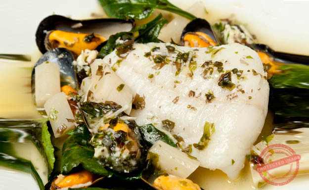 Preheat a pan. Finely chop the onions and garlic and sauté in a dash of olive oil. Allow to cool. In a separate pan seal the red mullet from one side for 1 minute than let cool. Add the cooked onions and garlic with the red mullet and squeeze in the juice of half a lemon and orange. Finally add the white wine vinegar and the mussels. Allow to marinate for 30 minutes and serve. For the citrus dressing, reduce the fish stock by half, squeeze in the juice of the remaining half lemon and orange and simmer for 10 minutes. Add in the olive oil and chill before serving.