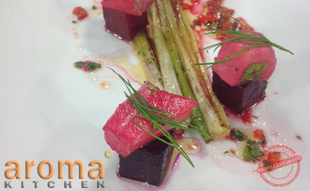 Start by marinate the diced salmon with the lemon juice, olive oil, vinegar and the beetroot juice. Allow to infuse and marinate for 20 minutes. Meanwhile, grill the capsicum for 2 minutes on each side and serve with the marinated salmon and cos lettuce.