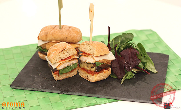 Gluten-free Mediterannean chicken ciabatta with grilled aubergine and sweet tomato relish