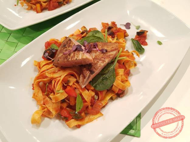 Start by sautéing the onion and garlic together with the olive oil for 2 minutes . Add in the pepper and zucchini , season with salt and pepper and fry for 2 minutes. Add in the tomato paste, cook for a minute then add in the tomato pulp with basil. Splash in a little water, olives and capers and cook gently for 10-15 minutes. When ready, turn off the heat and stir in the fresh mint. Meanwhile, cook the pasta in a pan of boiling water, and also season the tuna with salt and pepper and quickly pan-fry on both sides in a hot pan. To serve, mix the cooked pasta with the sauce, spoon into 2 plates and slice the tuna and place on top.