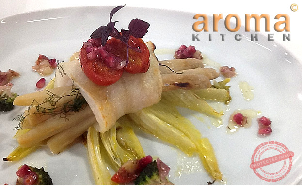 Blanch` the asparagus in boiling water for 2 minutes than cool in cold water. Meanwhile, sauté the onion and garlic in pan then add the fish stock and white wine. Reduce by half, then add the cream and continue to reduce till you achieve the right consistency. brush the filleted merluzz with a little olive oil. Place the asparagus stems in the middle and roll up . Place on a baking tray and cook the merluzz in oven for 10 minutes. Serve the baked merluzz with the creamy white wine sauce.