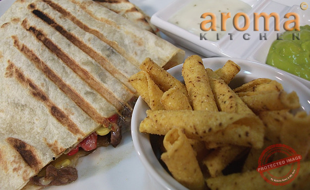 Din ir-riċetta hi ħafifa u tagħmilha malajr. Lesti z-zalza tal-qamħirrun billi tħallat l-ingredjenti kollha flimkien fi skutella. Kessaħha fil-friġġ. Imbagħad lesti l-mili billi tqalli t-tewm, il-basla u l-bżaru aħdar flimkien f’taġen kbir biż-żejt taż-żebbuġa. Żid il-biċċiet tal-laħam, il-Worcestershire sauce, iz-zalza tat-tabasco u żid ftit melħ għat-togħma. Aqli l-laħam għal ftit minuti, imbagħad itfa’ l-fażola ħamra. Issa tista’ tibda tlesti l-quesadillas. Poġġi t-tortillas fuq il-bank tal-kċina, imbiegħdin minn xulxin u qassam il-mili tal-laħam fuq l-erba’ wraps. Ifrex il-mili fuq in-nofs ta’ kull tortilla. Itfa’ mgħarfa zalza tal-qamħirrun u fl-aħħar ferrex il-ġobon Cheddar maħkuk fil-wiċċ. Itwi r-wraps min-nofs u sajjarhom fuq grilja miż- żewġ naħat sakemm it-tortillas jiġu jqarmċu u l-ġobon jinħall. Meta jkunu lesti, neħħihom minn fuq il-grilja u aqsamhom min-nofs. Servihom fi platti kbar u magħhom servi l- guacamole u sour cream fi skutelli.