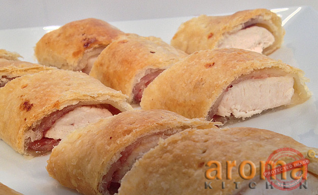 Heat the butter substitute in a frying pan and quickly seal the chicken pieces on all sides with the chopped thyme. Remove the chicken pieces from the pan and allow to cool down slightly. Next, wrap the chicken pieces in the pancetta. Spread the cranberry sauce over the puff pastry and place on the pancetta wrapped chicken in a line. Roll up the chicken completely in the puff pastry, like sausage rolls. Cut off any excess pastry and place the chicken onto baking sheets covered with non-stick baking paper and bake in the oven at 200`c for 20-25 minutes. Remove from the oven and cool slightly before cutting into small portions
