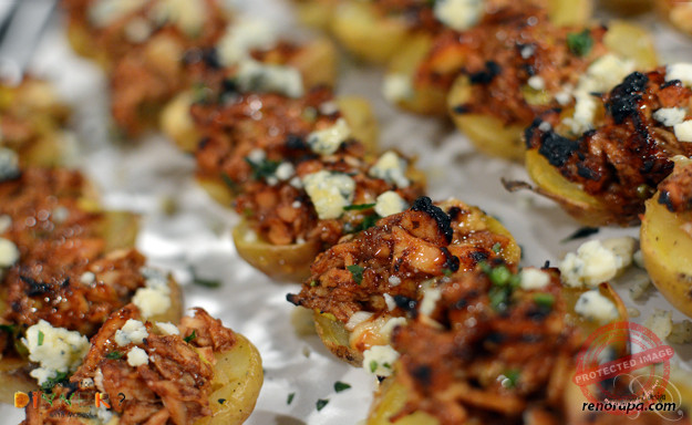 Mini stuffed potatoes with spicy chicken, blue cheese and honey