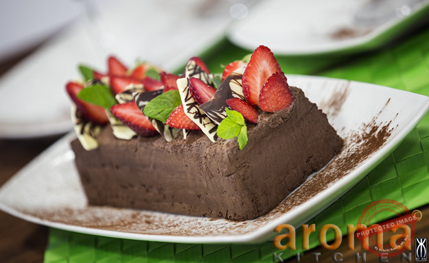 Start this recipe by preparing the loaf tin by coving the inside with a piece of cling film. Next, soak the gelatine leaves in a bowl of water. When soft, place into a saucepan with 2 tablespoons of water and melt to dissolve. Put aside. Whilst the chocolate is melting, whisk the egg whites and lemon juice in a large, clean bowl until they form soft peaks. The lemon juice will stabilise the egg whites, make them easier to work with. Add the sugar and continue to whisk until firm peaks form when the whisk is removed. In another bowl, whisk the cocoa powder and the fresh cream together to soft peaks and put aside. When the chocolate has cooled down slightly, whisk in half of the egg whites quickly, stirring vigorously until thick and well combined. Fold in the remaining egg whites into the chocolate mixture, using a spatula, until all of the egg white has been completely incorporated, followed by the whipped chocolate fresh cream. Quickly spoon 1/3 of the mousse mixture into the base of the prepared tin and even out. Cover with a layer of the `After-eight` mints. Cover again with another 1/3 of mousse and mints, followed by the remaining cream. Finally, cover the top evenly with a final layer of mints. Wrap over the excess cling film and chill in the freezer for an hour, or until set. Carefully place the parfait on a long serving plate and decorate with chocolate straws and mint leaves.
